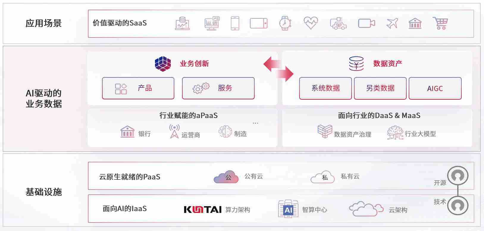 数字时代,,围绕企业数字化转型的关键要素,,,,k豆钱包数码开创性的提出数云融合战略和技术体系框架,,,着力在云原生、、、数字原生、、、AI原生和信创产业上架构产品和服务能力,,,,为处在不同数字化转型阶段的快消零售、、、、汽车、、、金融、、、医疗、、政企、、、、教育、、运营商等行业客户提供泛在的敏捷IT能力和融合的数据驱动能力,,构建跨界融合创新的数字业务场景和新业务模式,,,,助力企业级客户建立面向未来的核心能力和竞争优势,,,,全面推动社会的数字化、、、智能化转型升级。。。